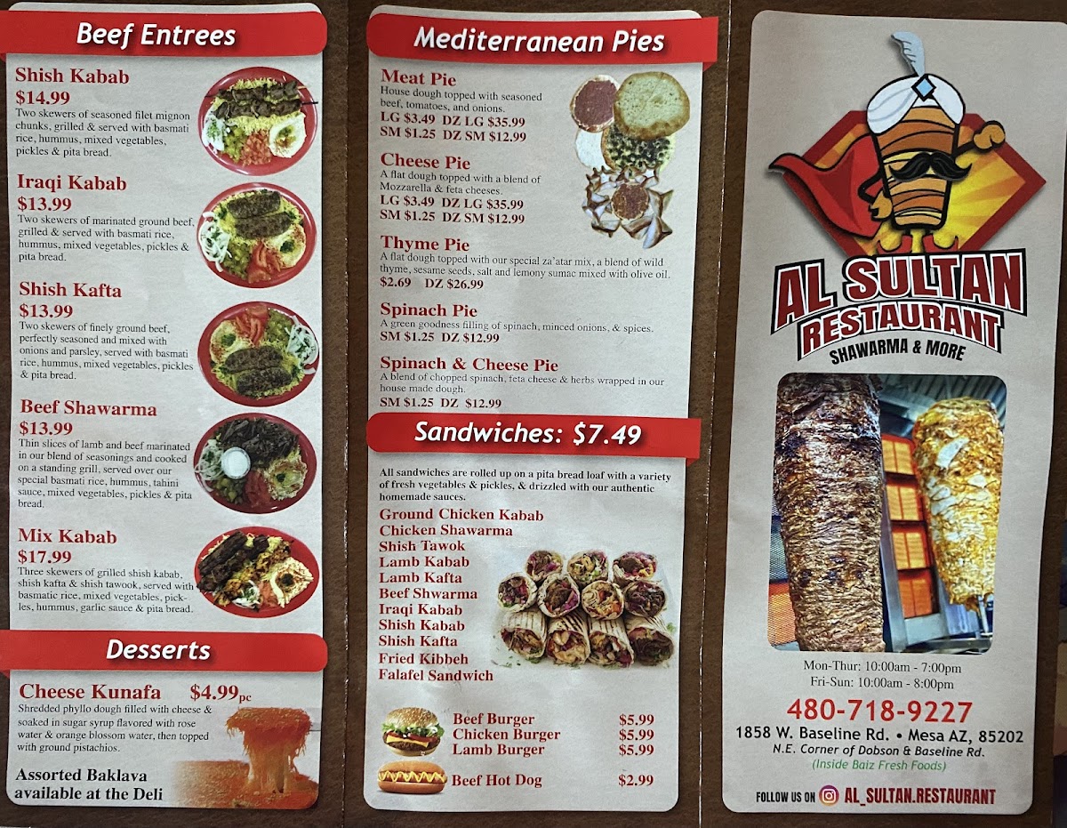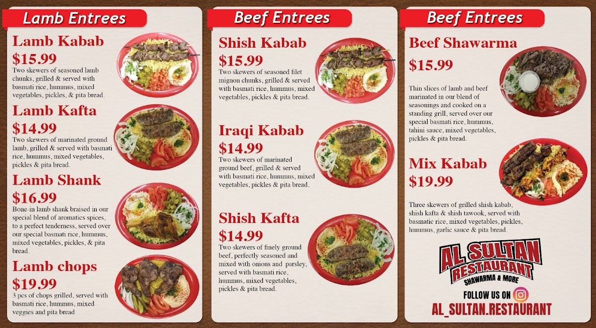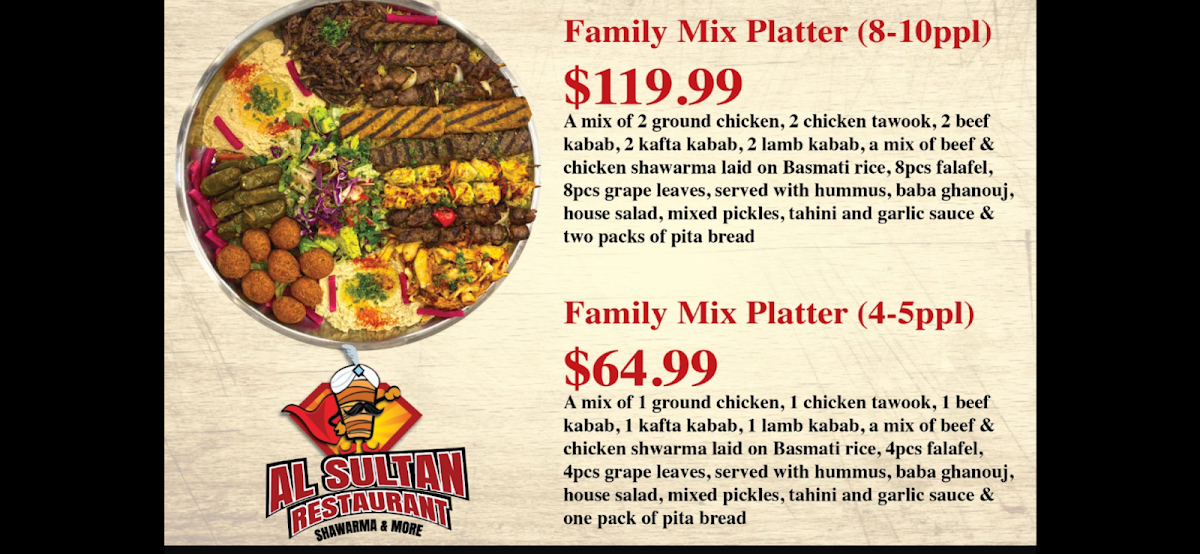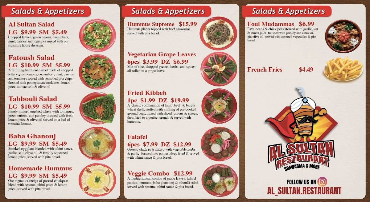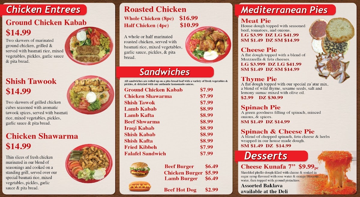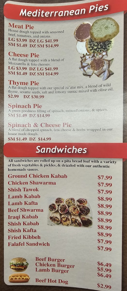From a reviewer’s perspective, the menu at Al Sultan Restaurant offers a rich and satisfying variety of Middle Eastern dishes that feel both authentic and generously portioned. The selection starts strong with fresh options like Al Sultan Salad, Fatoush Salad, and Tabbouli Salad, alongside classic appetizers such as Baba Ghanouj and Homemade Hummus. Their sandwich lineup-including Ground Chicken Kabab, Chicken Shawarma, Shish Tawok, Lamb Kabab, and Lamb Kafta-is flavorful and convenient, while the entrée sections expand these same favorites into hearty plates like Roasted Chicken, Chicken Shawarma, Lamb Shank, Lamb Chops, Shish Kabab, Iraqi Kabab, and Mix Kabab. The Mediterranean Pies-notably Meat Pie, Cheese Pie, Thyme Pie, and Spinach & Cheese Pie-add a comforting, baked dimension to the menu. For groups, the Family Mix Platter (8-10ppl) and Family Mix Platter (4-5ppl) stand out as excellent value options, showcasing a variety of meats. To round things off, desserts like Cheese Kunafa 7" and Assorted Baklava provide a sweet and traditional finish. Overall, the menu impresses with its breadth, consistency, and dedication to classic flavors.