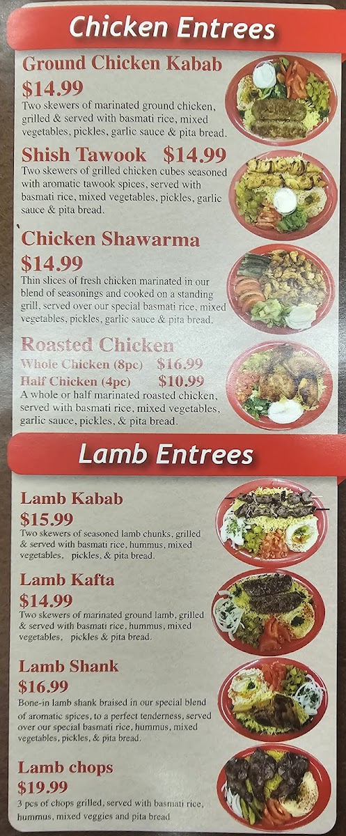 Thin slices of lamb and beef marinated in our blend of seasonings and cooked on a standing grill, served over our special basmati rice, hummus, tahini sauce, mixed vegetables, pickles & pita bread.